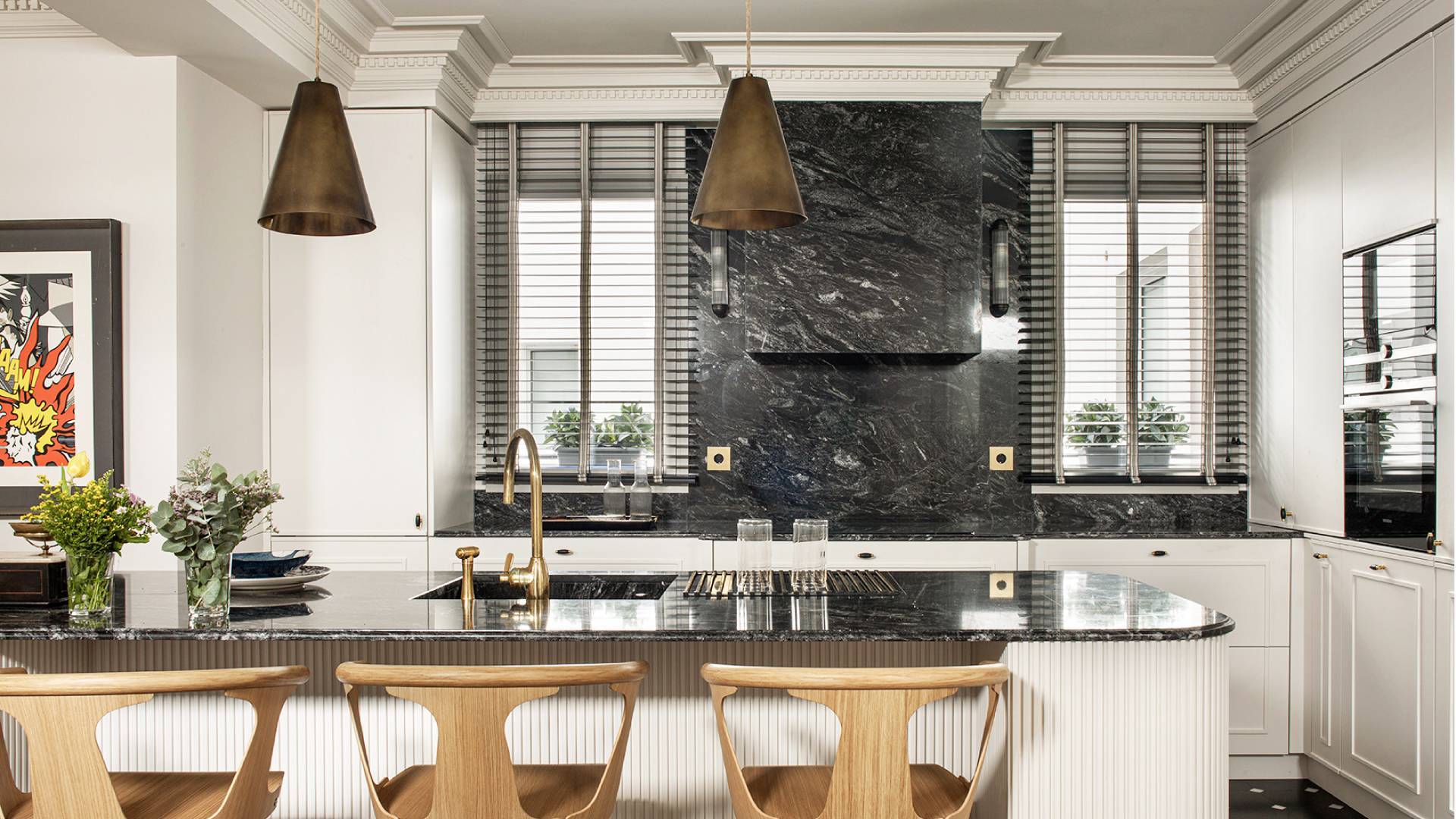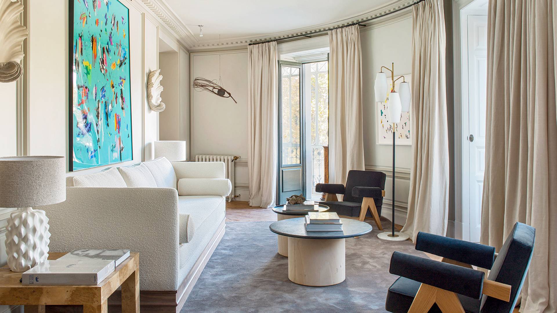 La arquitectura interior la trabaja como un elemento decorativo más: molduras y rodapiés altos, puertas y armarios trabajados, suelos especiales… todos respiran la misma coherencia en el conjunto de la obra.