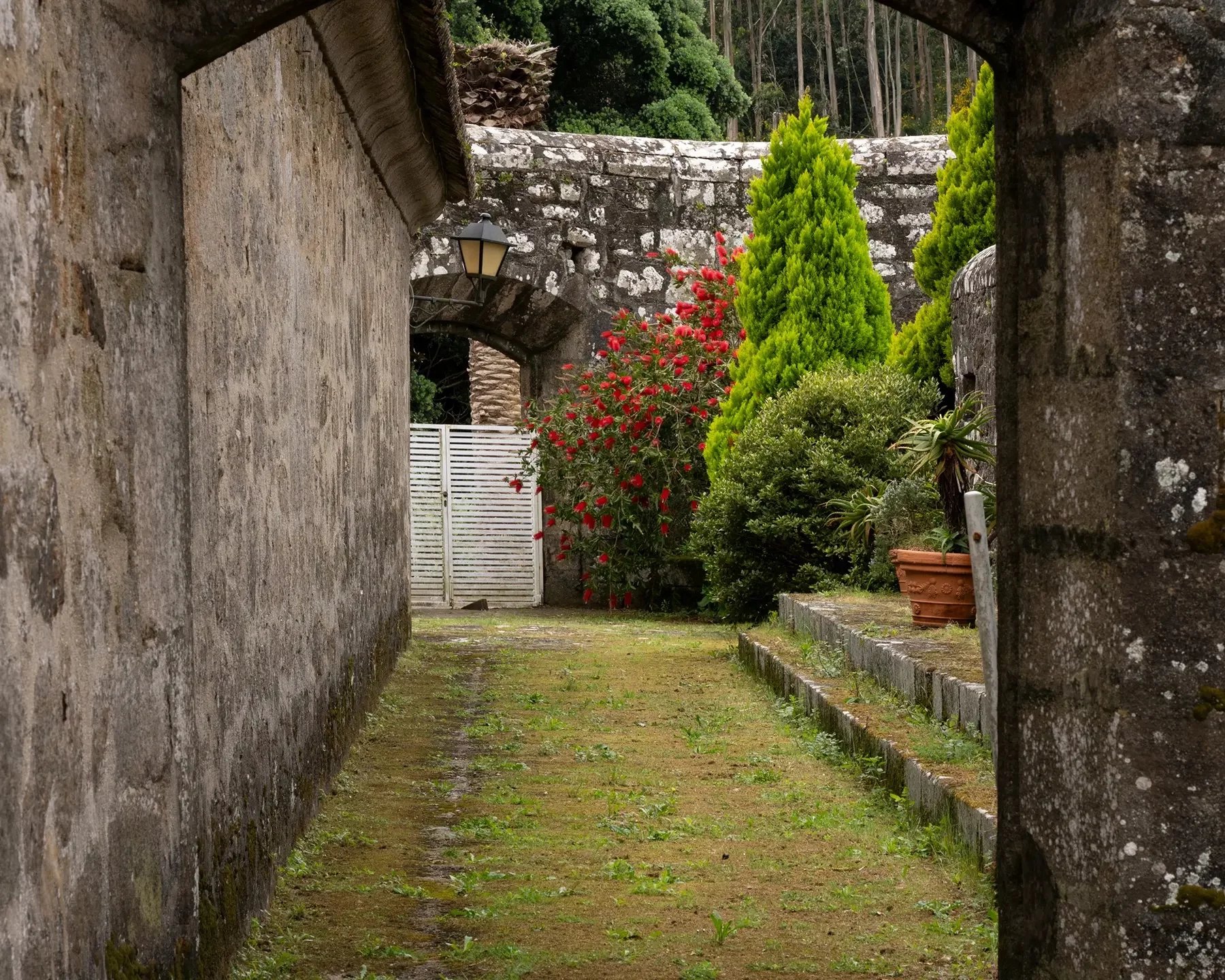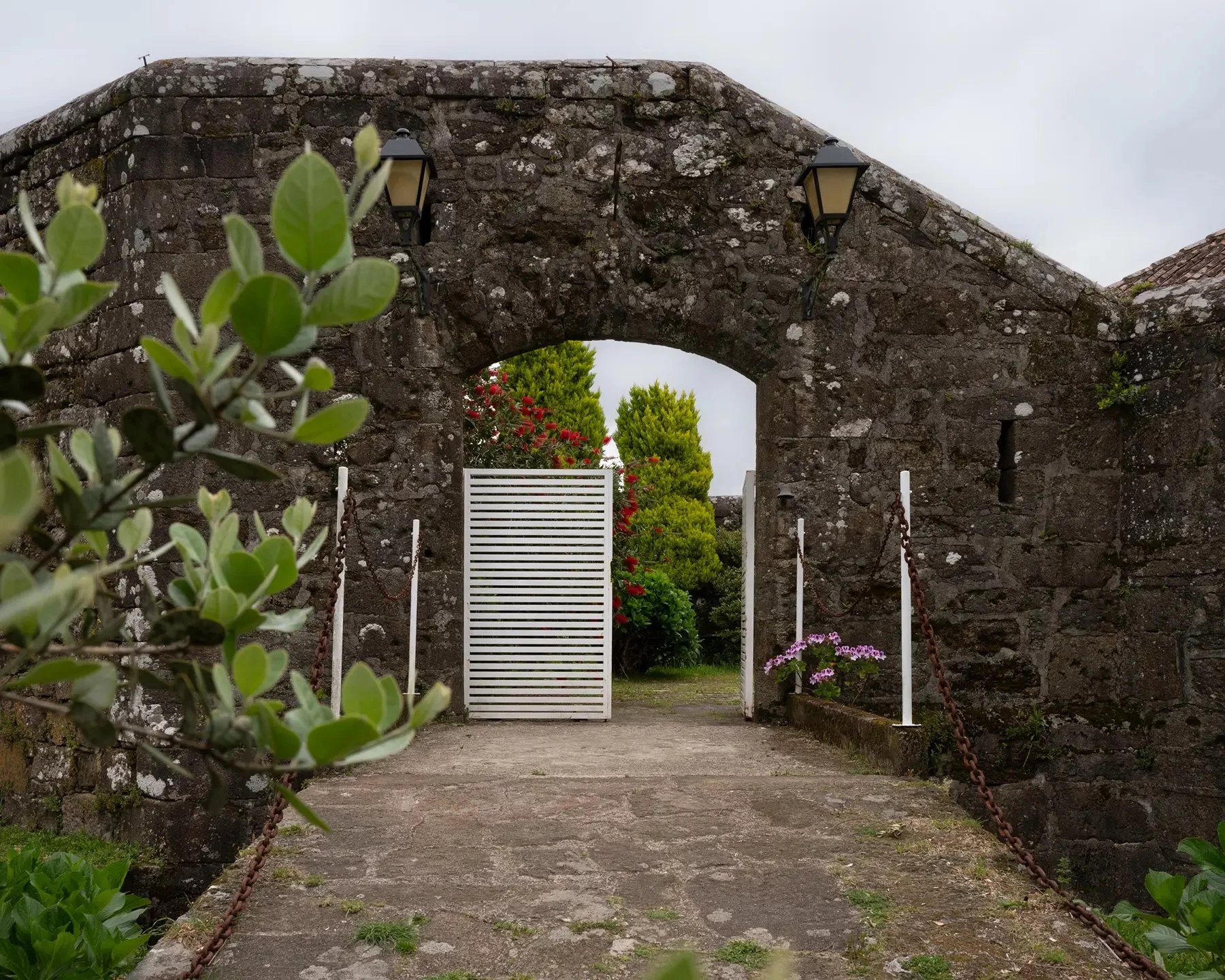 L’extérieur propose un jardin soigné avec des hortensias et des espèces locales, ainsi qu’un accès direct à la mer qui témoigne de la relation historique du château avec la côte.